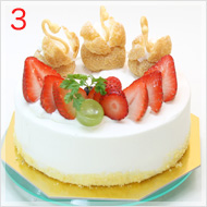 白いスポンジにフルーツ、生クリームをサンドしています。シュー生地でできた白鳥さんがポイントです。