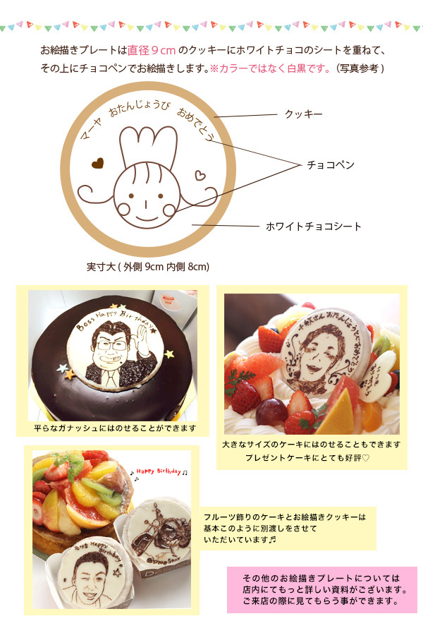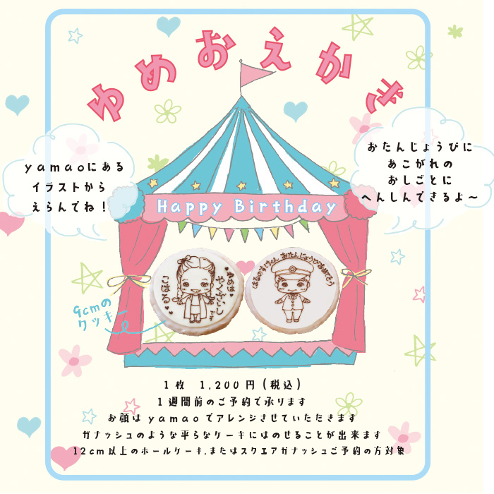 yamaoでは動物や似顔絵などをクッキーにお絵描きをしています。200円(税込み)〜 デコレーションケーキをお買い求めのお客様にこちらの特別価格でお作りしています。お絵描きクッキーは手づくりですので、いただいたサンプル通りできない場合がございます。(できる限り近づけるように努力します。)