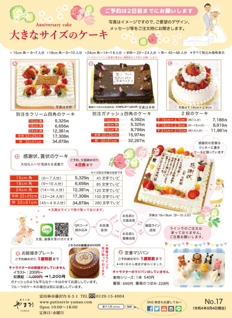 ***チラシに載っていない別注ケーキ(味や形が違うものなど)については、出来るもの、出来ないものもございます。また日にちを頂戴します。お電話で1週間前までにお問い合わせをお願いします。(6日前だと承れません)